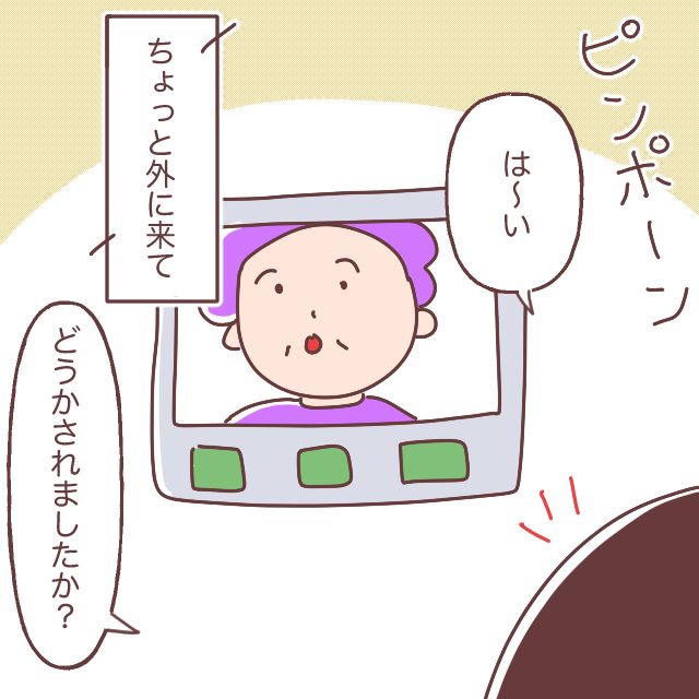 ピンポーンとインターホンが。「は~い」とモニターを覗くとおばあちゃんの姿が!「どうかされましたか?」と聞くと、「ちょっと外に来て」と言われ、外に出ると、