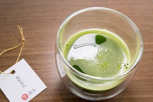ヘンタ製茶の霧島有機抹茶「ゲンセン霧島茶006」を冷茶で点て、そこへ国分酒造の芋焼酎「蔓無源氏 原酒」を加えます。深く濃いキレイな緑色で、抹茶の爽やかな苦味に焼酎のコクや旨味が加わったサラリとした味わい。抹茶と焼酎という未知のペアリングに驚かされました。特に、焼酎が好きな方にはもちろん、焼酎が苦手な方、焼酎を初めて飲む方にもおすすめできるお茶と焼酎、お茶請けのペアリング体験でした。