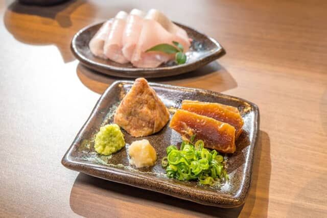 養殖カンパチの水揚げ日本一の鹿児島県。茶葉で育てたカンパチに、麦味噌と鰹節で作った味噌玉や、桜島大根の漬物をトッピングしていただきます。お茶に含まれる旨み成分のグルタミン酸と魚に含まれるイノシン酸は、一緒に食べると旨みが増す組み合わせ。桜島大根の漬物もアクセントです。