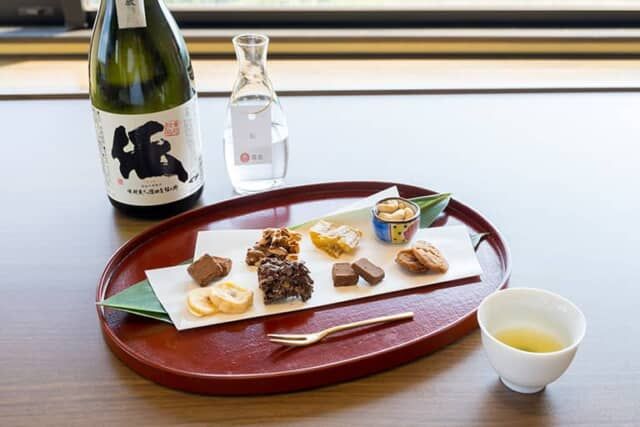 お茶請けもこだわりの品々。チョコレートやドライバナナ、干し芋や梅干しなど、8種類の焼酎に合わせた個性あふれる組み合わせです。写真は濱田酒造が黄麹で仕込んだ本格的な芋焼酎「伝」で、柔らかな口あたりが飲みやすく、玉露のような「ゲンセン霧島茶008」の旨味とマリアージュ。おつまみは「薩摩西郷梅 完熟種無し干し梅」で、優しい酸味が焼酎とお茶を引き立てます。この3種を共に味わう体験は予想を超える美味しさ。どの組み合わせも満喫できます。