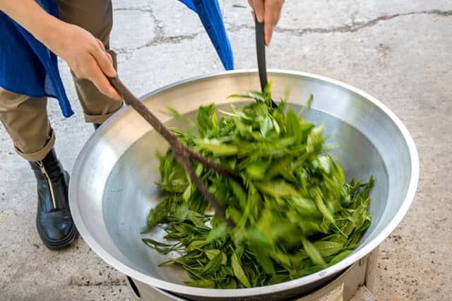 摘み取った茶葉を熱した釜にあけ、まんべんなく火が通るようにかき回します。釜で炒る製法は戦国時代末期に大陸から九州に伝わったもので、それまでの天日干しにした茶葉を煮出す低品質のお茶に代わり、江戸時代中頃まで主流になった製法です。