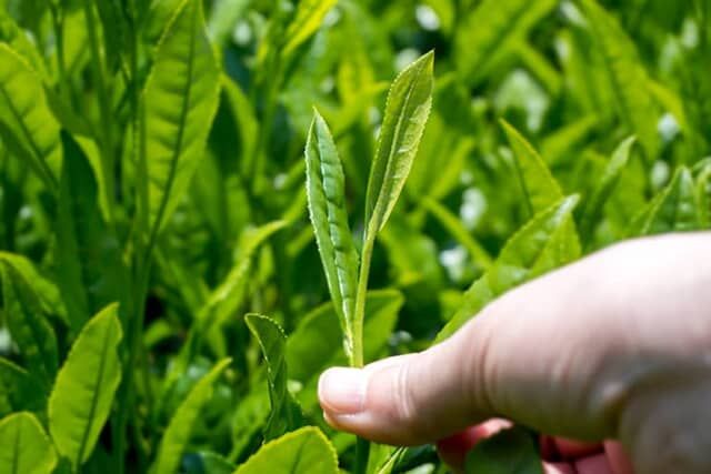 ▲柔らかな新芽部分を摘む「一芯二葉」