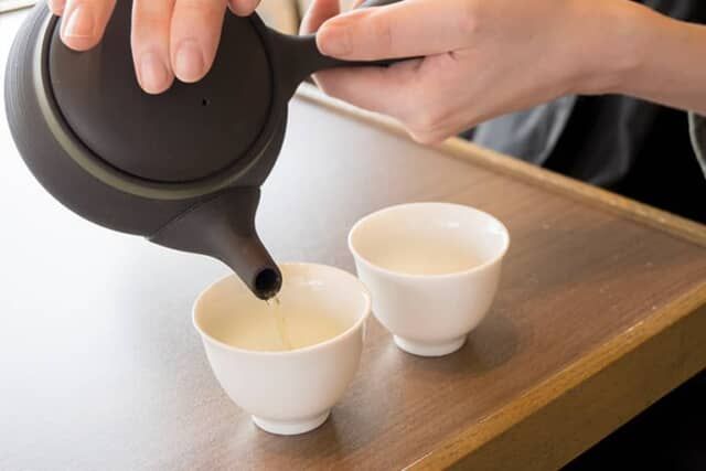 お茶と焼酎のペアリングでは、専門のスタッフが最適な状態でお茶を淹れ、8種のブランド茶を順に味見。そのあと気に入ったお茶に鹿児島産の焼酎を合わせ、意外性たっぷりのお茶と焼酎のペアリングをおこないます。