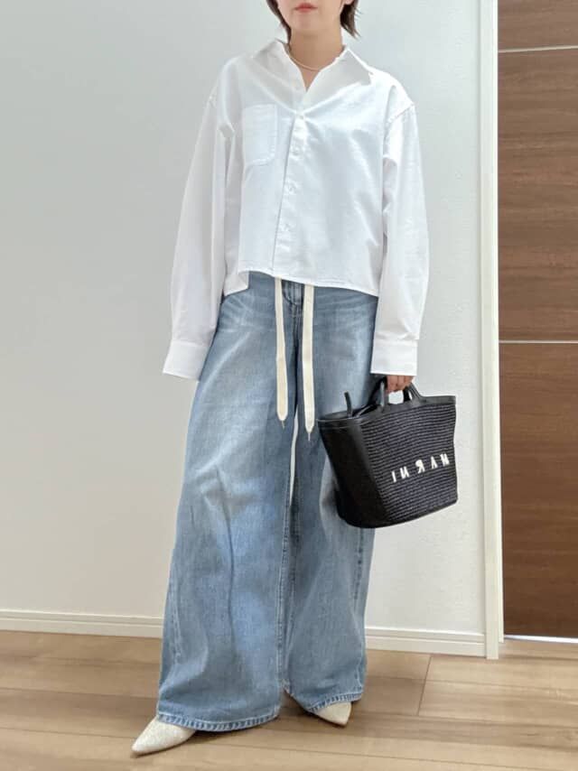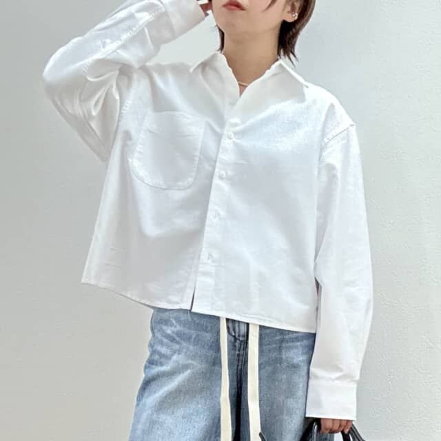 定番の白シャツ×デニムコーデも、ユニクロのショート丈シャツならグッと新鮮に。ワイドデニムとも相性が良く、バランスのとれたシルエットでスタイルアップも狙えます。