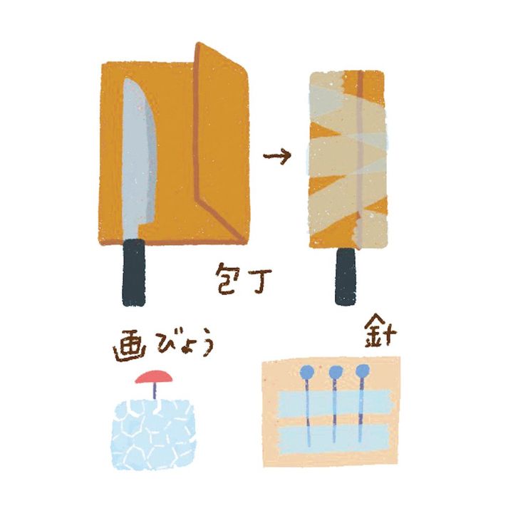 袋が破れて中身が飛び出すと危険なため、包丁はダンボールなどに包み、画鋲やマチ針は発泡スチロールに刺すなど、尖った部分を緩衝材に包んで捨てましょう。抜けないようしっかりと固定するのがコツです。