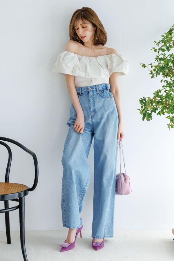 プルオーバー¥16,500/FRAY I.D パンツ¥42,900、ピアス¥17,600/ともにダブルスタンダードクロージング(フィルム) バッグ¥176,200/ピエール アルディ(ピエール アルディ東京) ジャンヴィトロッシのパンプス/美香私物