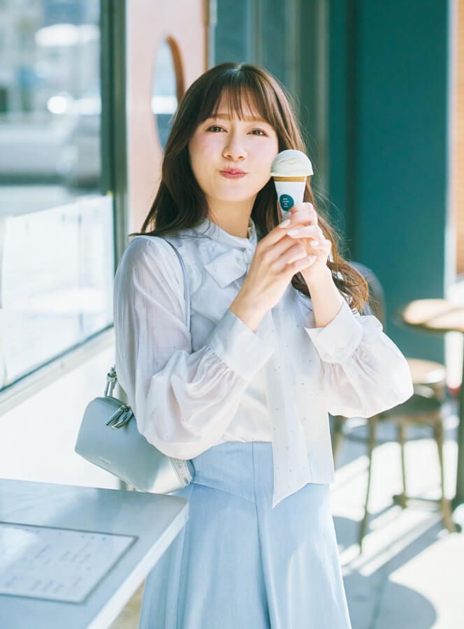 フェミニンコーデに欠かせないボウタイブラウスは、シアー素材&ラメ糸入りを選べば1枚着ただけで華やかな印象に。爽やかなブルーのスカートを合わせれば、春らしいフェミニンスタイルが完成。