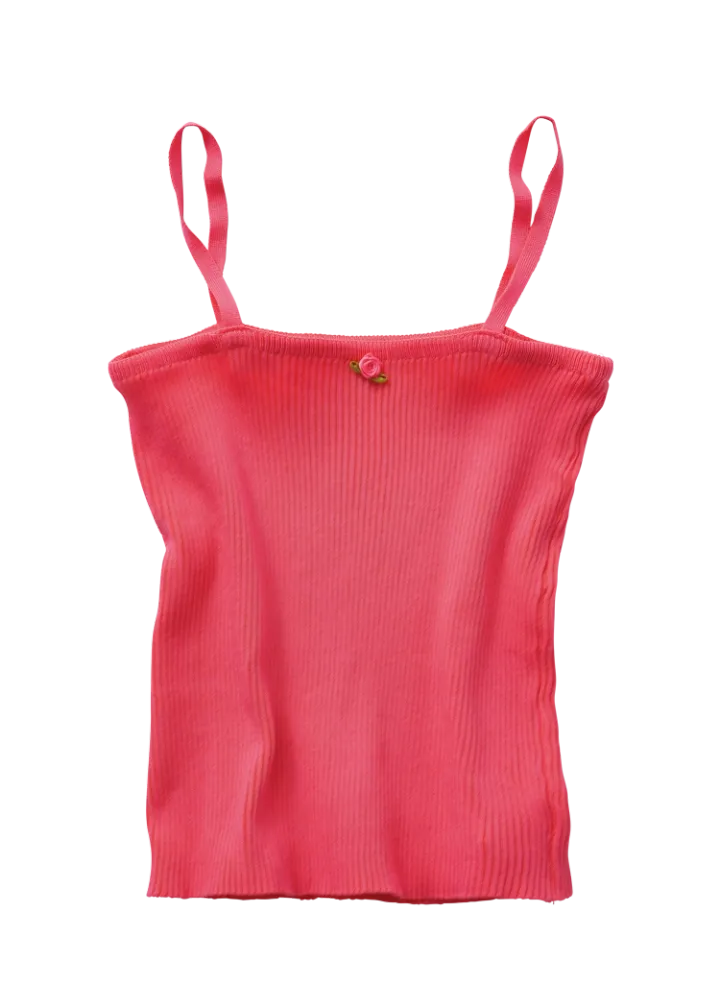 鮮やかなピンクのキャミは主役にも、差し色として脇役にもまわれる優秀アイテム。自然な肌見せができるのもポイント。