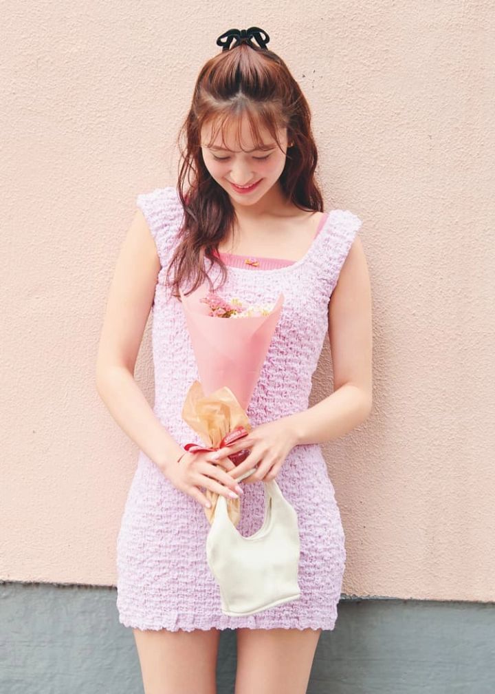 ピンクキャミソールは着回し。パープルミニワンピ 18,700円/HONEY MI HONEY ヘアリボン 17,600円/THE HAIR BAR TOKYO(THE HAIR BAR TOKYO)イヤリング 4,180円/ミミサンジュウサン(サンポークリエイト)バッグ 11,400円/ヨミム(HANA KOREA)