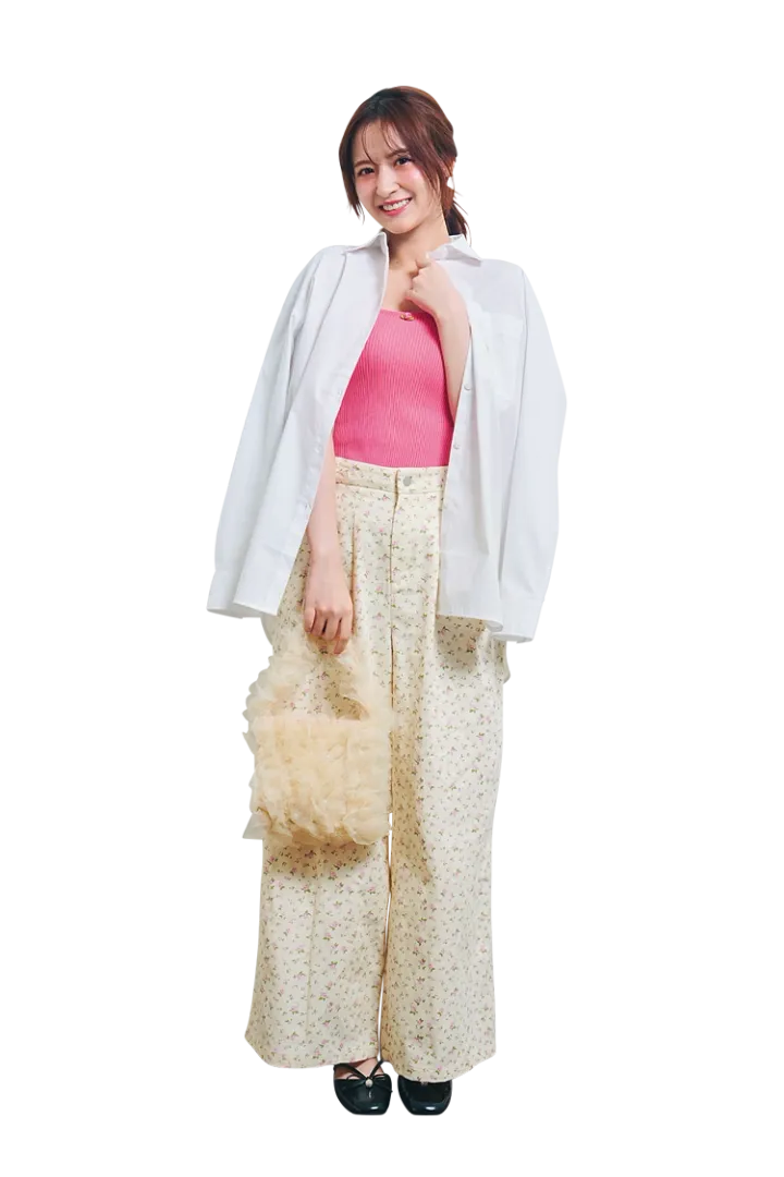 ピンクキャミソールは着回し。小花柄デニムパンツ 11,000円/PELLICULE イヤリング 2,310円/アネモネ(サンポークリエイト)バッグ 6,490円/NADIA FLORES EN EL CORAZON パンプス 8,900円/チャールズ&キース(チャールズ&キース ジャパン)シャツ/スタイリスト私物