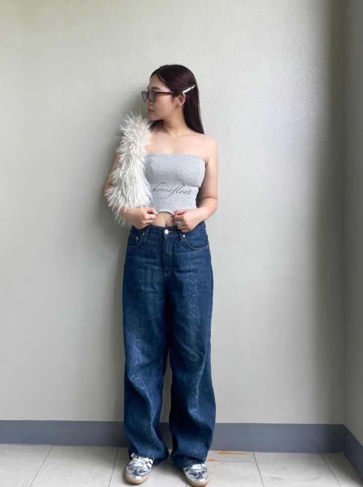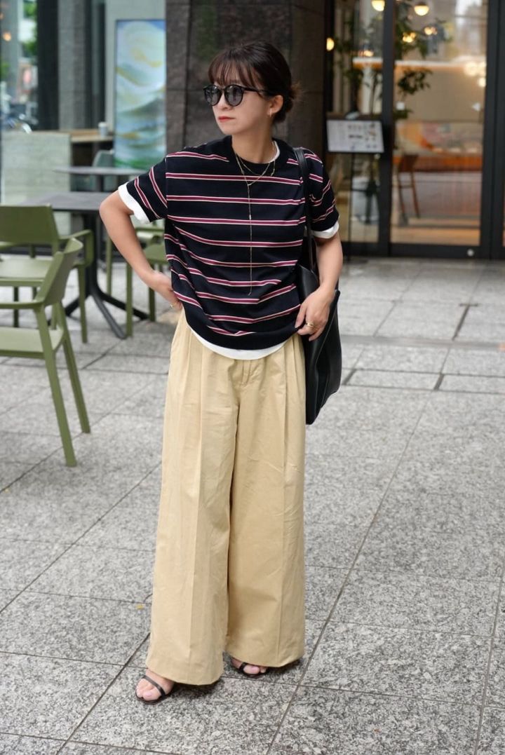 「華奢なゴールドのジュエリーが映えるよう、ボートネックにもオフショルにも出来る短丈トップスに、ハイウエストのワイドシルエットのボトムを合わせシンプルに。ほどよく肌見せをすることで女性らしさと洗練された雰囲気を取り入れたコーディネートにしています。足元はボリュームのある黒スニーカーでヌケ感をプラスしました」