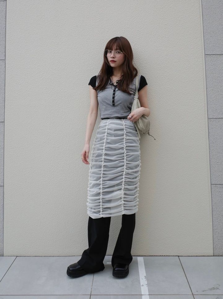 「ジュエリーを主役にしたくて、モノトーンでシンプルにスタイリングをしました。シアーなスカートをレイヤードすることで、自分らしさとモードな雰囲気が出るよう意識しています」