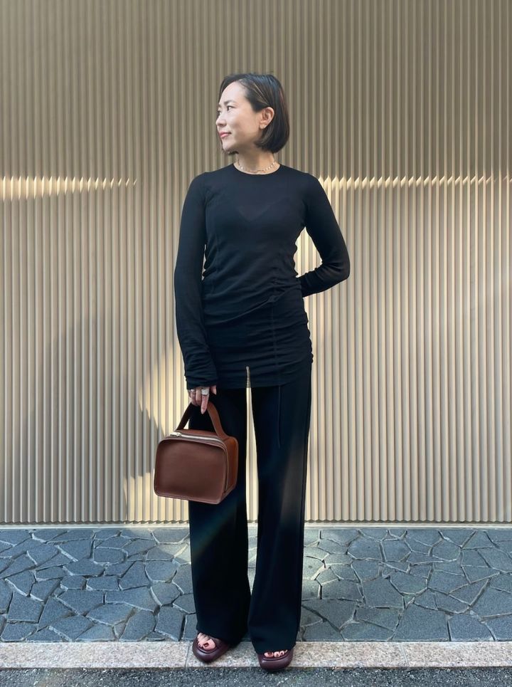 「ジュエリーをポイントにしたくて、ブラックに統一したスタイリングに。シアー感のあるデザイントップスとラインがとてもきれいなパンツは、今季購入したお気に入りのウエアたちで、タイトでロングなシルエットのコーデを意識しました。小物はブラウンやバーガンディを選び柔和なさし色に。ジュエリーは今気になる軽やかな色で大ぶりな石のリングを合わせヌケ感をプラスしました」