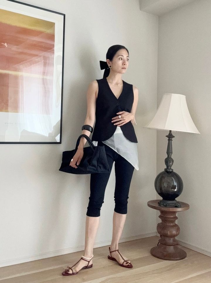 「シンプルな着こなしをジュエリーで飾るのが好きです。最近はコスチュームジュエリーと上質なファインジュエリーをミックスするスタイルにはまっています。クラシックなムードが気分なので、大ぶりのイヤリングやヘアボウ、パールを効かせてモノトーンコーデにアクセントをプラスしています」