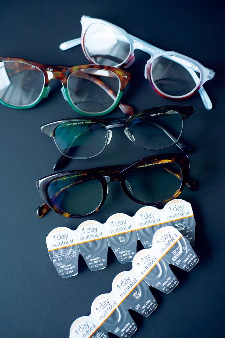 リーディンググラスは洋服に合わせてデザインを選んだり、シーンによって度数違いのものを。