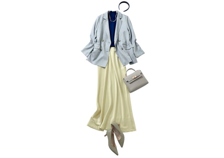 テーラードジャケット¥27,500、ハイネックアンサンブルニット(ニット)¥18,920、サテンナロースカート¥17,600/以上マイストラーダ ワンハンドルバッグ¥3,848/grove(ワールド) ミドルヒールパンプス¥7,700/オリエンタルトラフィック(ダブルエー) カチューシャ¥1,870/アネモネ(サンポークリエイト) パール×チェーンネックレス¥30,140/ジゼルベー(ズットホリック)