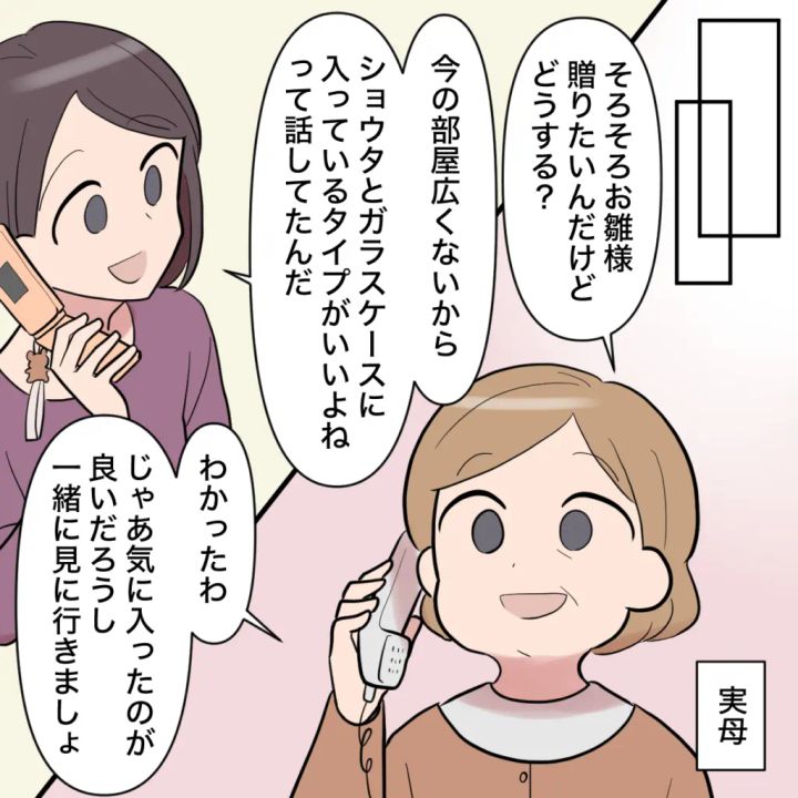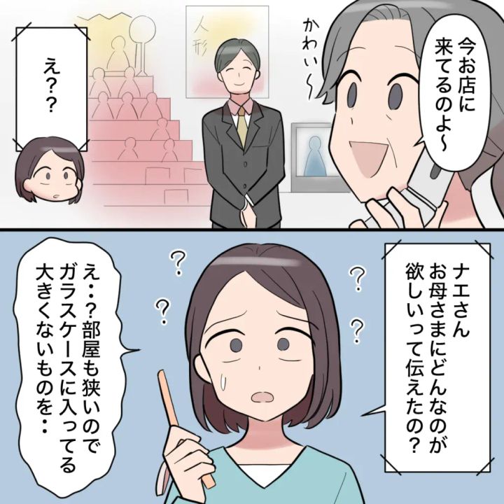 「今お店に来てるのよ~。」と、お店から電話をしてきている義母は嬉しそうに言いました。母からプレゼントしてもらえるお雛様なんだけどな。なぜ?義母はひとりでお店にいるようでした。「ナエさん、お母様にどんなのが欲しいって伝えたの?」と聞かれ、「部屋も狭いのでガラスケースに入ってる大きくない物を」と伝えている途中で、義母は私の話など最後まで聞く気がないようでした。