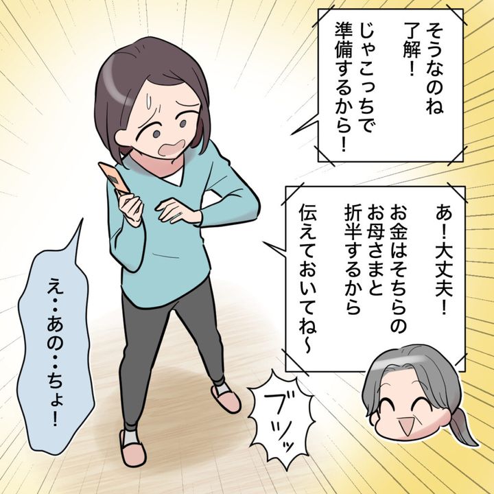 「そうなのね、了解!」と、私の言葉を遮って義母は話し始めました。「じゃ、こっちで準備するから!あ、大丈夫!お金はそちらのお母様と折半するから伝えておいてね~。」義母は自分が言いたい事だけ言うと、「え、あの、ちょ!」と言っている私はお構いなしに電話を切ってしまいました。
