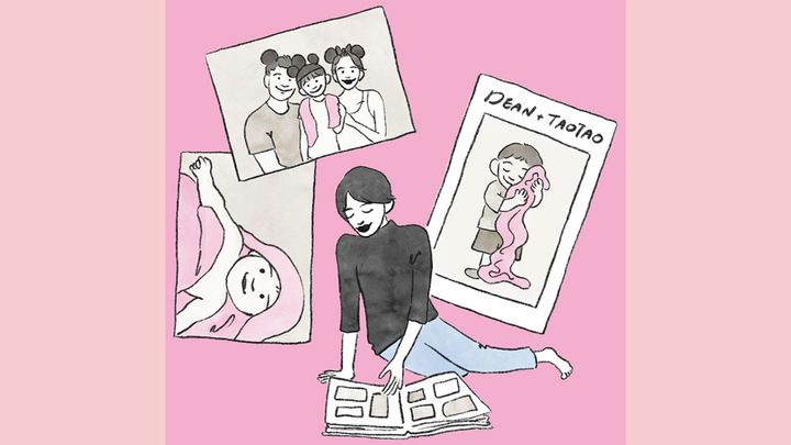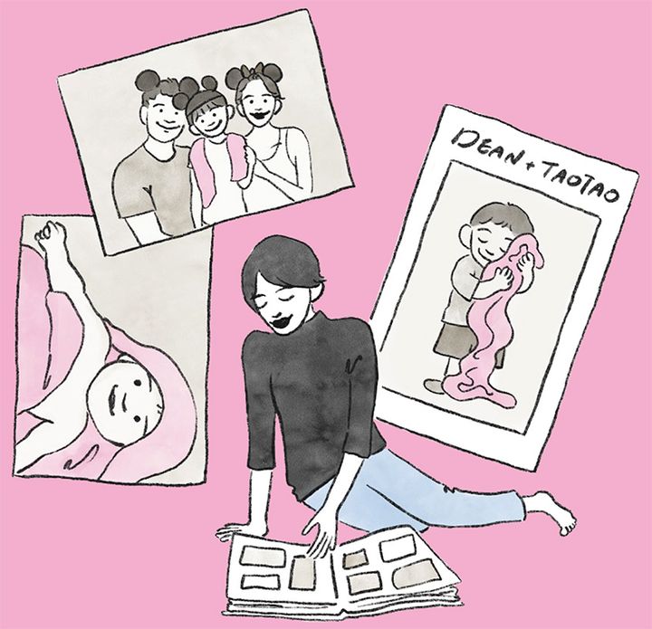 そんなタオタオは家族の一員のような存在で、どの家族写真にもピンクのボロボロのタオルは写り込んでいる。ピンクというかもはや洗いすぎて白くなってきてる。