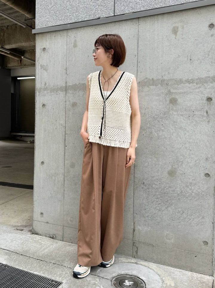 「ニットジレとラフなワイドパンツに、コードのネックレスやヴィンテージの存在感があるイヤリングを合わせて、モードな雰囲気に仕上げました。アクセサリーはゴールドとシルバーをMIXするのが好きなので、手元には必ずどちらもつけています」
