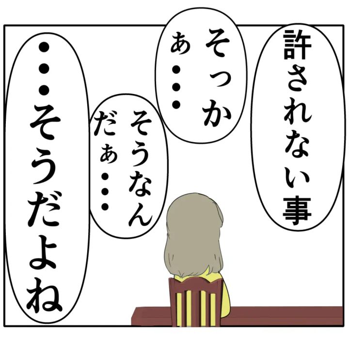 「俺達は絶対に許されない事をしてしまったんだよ」とめが根さんに言われたジュリ実さんは、「許されない事」とめが根さんの言葉を繰り返し、「そっかぁ・・」「そうなんだぁ・・」と呟くと、ようやく納得できたようで「・・そうだよね」と静かに言いました。