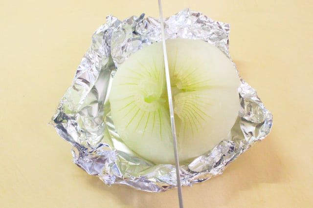 2. 大きめに切ったアルミホイルの上に1を取り出し、新玉ねぎの大きさ・形に合わせて、アルミホイルで包みます。新玉ねぎの上部に十字に切り込みを入れて、軽く開きます。