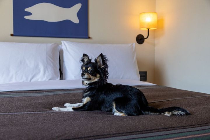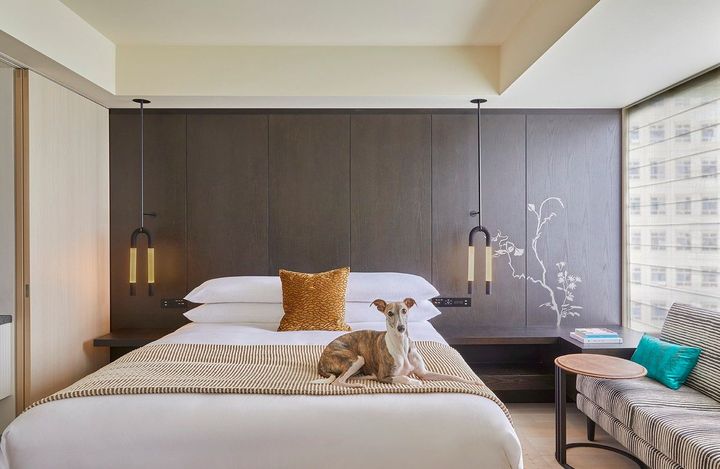 客室は「エースホテル」ブランドらしく、上質でスタイリッシュかつ抜群の居心地。アメニティも充実しており、犬用ベッド、フード&ウォーターボウル、トイレ用品、消臭スプレー、除菌ウェットティッシュ、加湿空気清浄機、毛取りクリーナーなどを完備。ロビーもリードを付けていれば歩くことが可能で、エントランスには犬用のおやつも用意されている。
