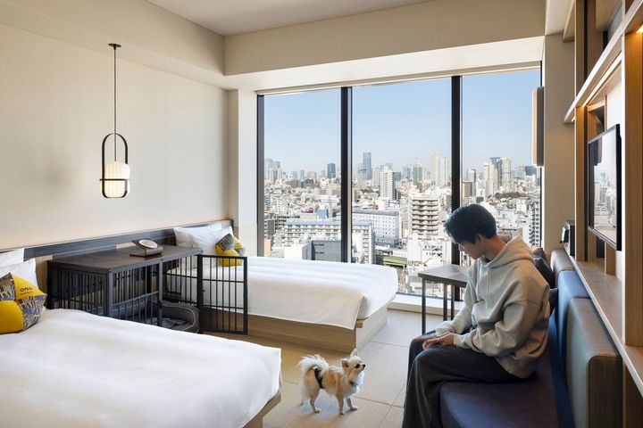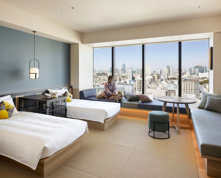 ビルの高層階という利点を生かした快適な客室には、撥水加工生地のソファや樹脂素材の畳など愛犬のための配慮が存分に施されている。ケージや食器、トイレシートなども備えられており、ミニマルな荷物で訪れることができる。天井まで届くような大きな窓ガラス、そして窓際には客室ごとにソファやベッドが配され、高層ビルの少ない五反田ならではの景観が楽しめるのも魅力だ。