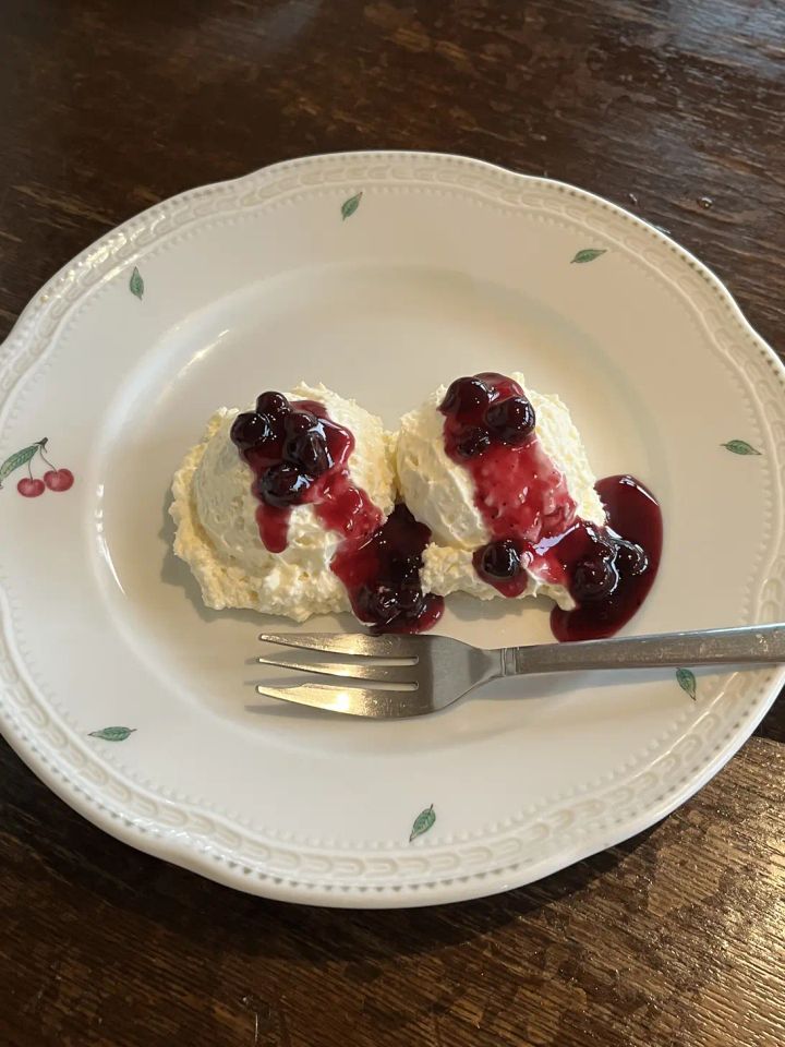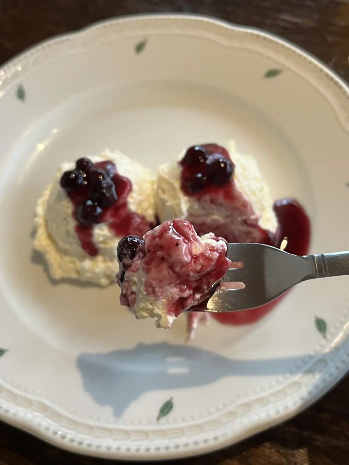 レアチーズはスフレ状のふわふわとした食感で、ブルーベリーソースがたっぷり。