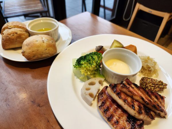 同行した息子は「手作りベーコンの網焼きとたっぷり温野菜添え」(1100円)にパン(275円)を注文。