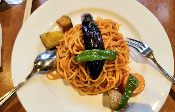 今回はがっつり食べたくて、ベーコン入り自家製ケチャップ使用「彩り野菜のナポリタン」(935円)を注文しました。パスタの周りに豪快に盛り付けられているカリッと香ばしいゴロゴロお野菜がとても甘く、食べ応えがあり、トマトの酸味と甘みが感じられる自家製ケチャップ、もちもちしたパスタとの相性もばっちりで、大満足でした。