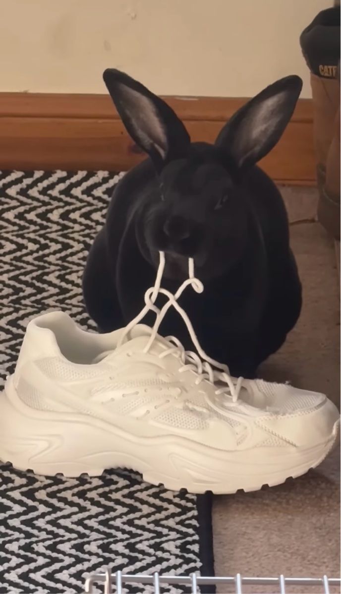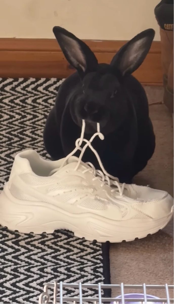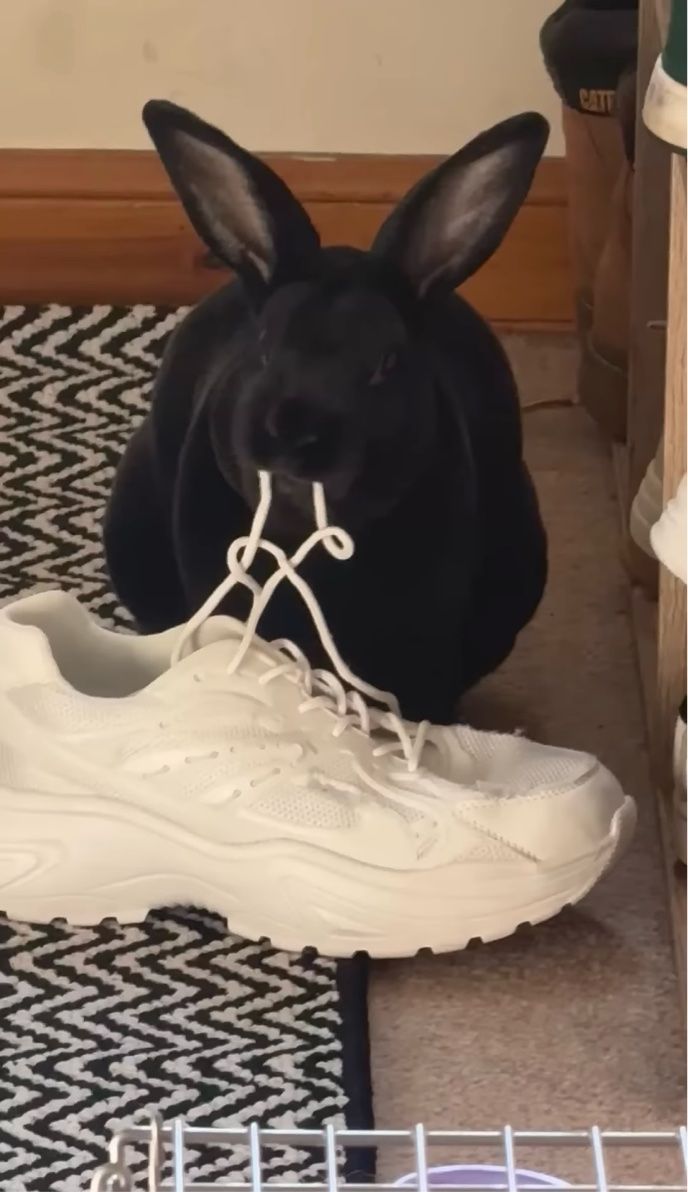 ウサギがもちゃもちゃ。無心でかじり続けているのは・・スニーカーの靴紐!?【海外・動画】