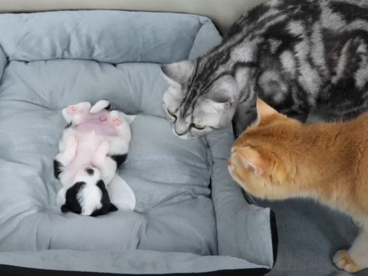 3. 「ねぇ 動いてないよ?」猫さんが心配しちゃう子犬さんの熟睡ぶり