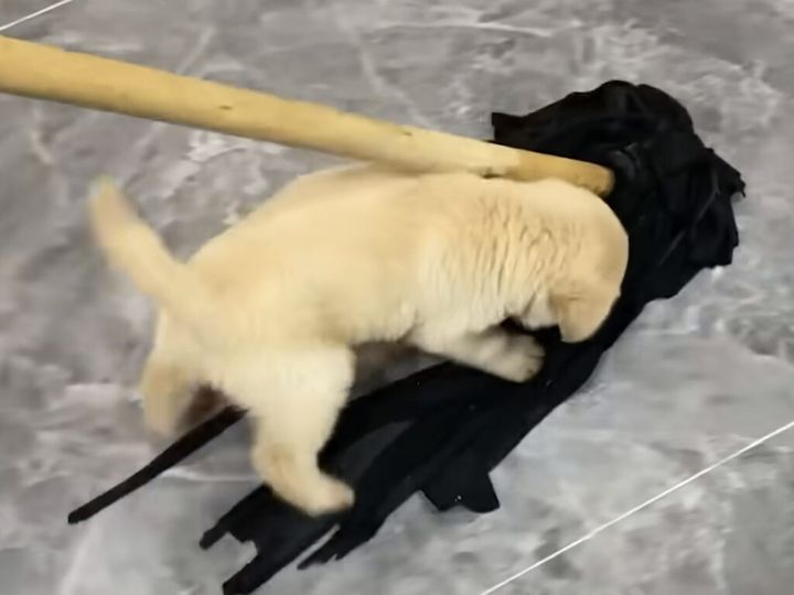 モップの先を追いかけて、トコトコ走り回る子犬さん。