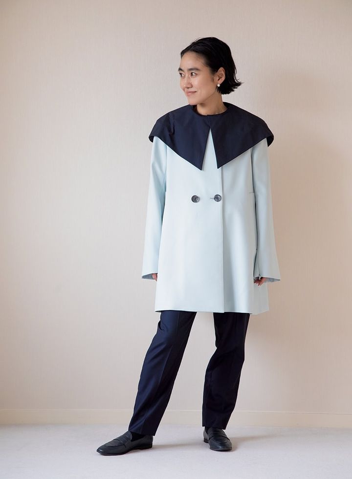 せっかくなら明るい色を選んで。コート¥63,800(ランバン オン ブルー)、Drawerのトップス、PRADAのパンツ、Dhyana.のローファー、COUDREのピアスは本人私物