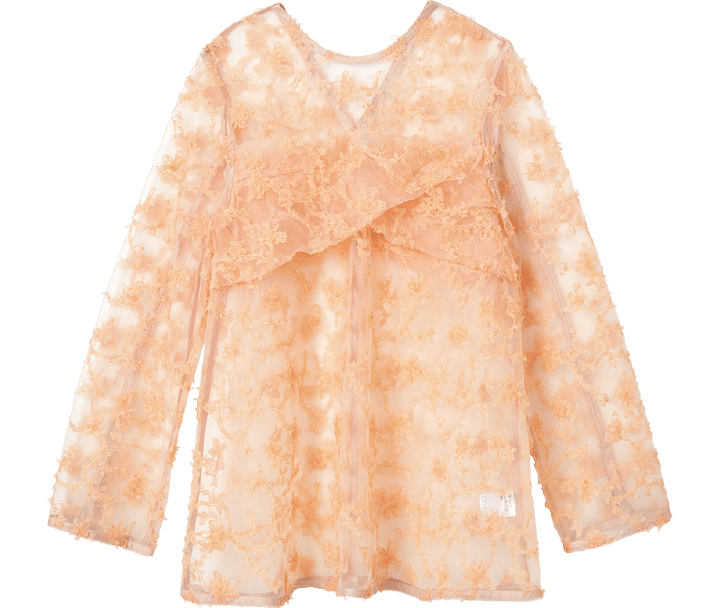 「可愛過ぎてどうしましょう案件! 春らしさ全開のロマンティックなトップスは一目惚れしました。ピンクもトレンドだし、欲しい。インナーは黒よりもベージュの方がいいかも」