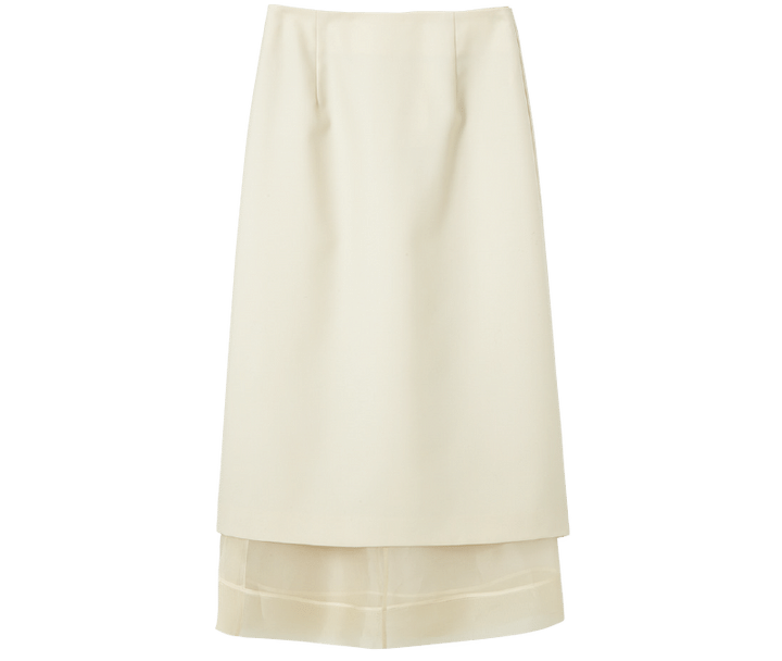 少しチュールが覗くだけで旬な印象に。レイヤードスカート¥72,600(エブール/リトルリーグ インク)