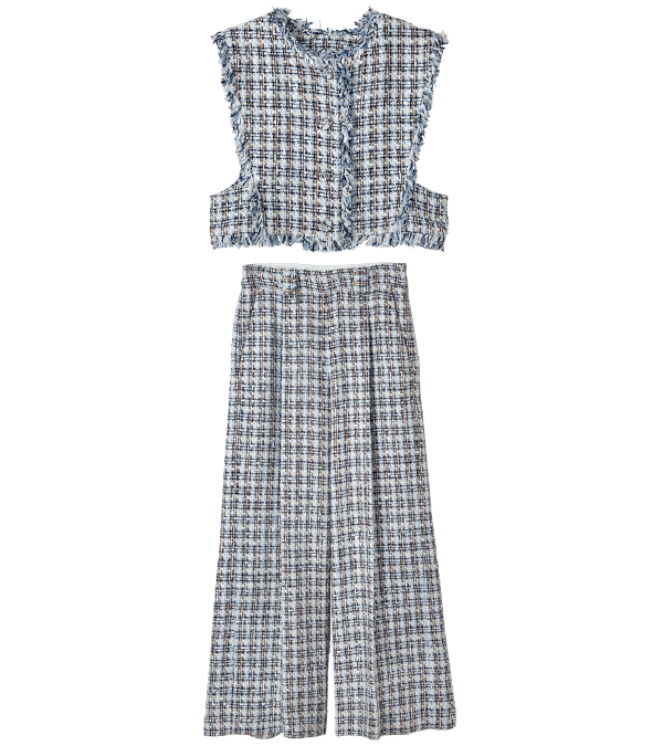 ツイードベスト¥30,800、ツイードパンツ¥41,800(共にランバン オン ブルー)
