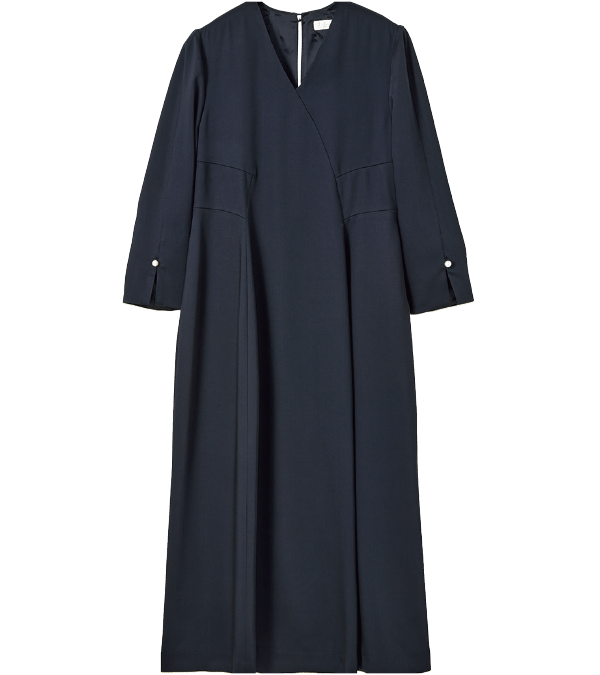 「トゥモローランドの展示会で見つけたこちらのドレスは、少しエッジがきいていて洒落感があります。袖にさり気なく付いているパールがタイプ」