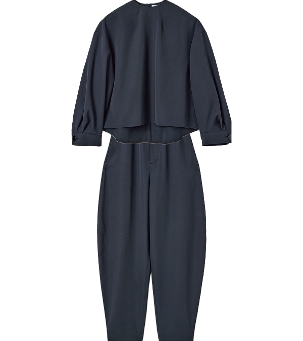 「極めてシンプルなデザインだけど、ハリ&光沢のある素材で、着るだけで様になる濃紺のセットアップ。保護者会など普段の学校行事でも活躍してくれます」