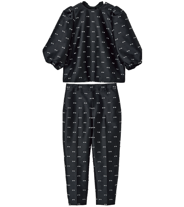 「よく見るとリボン柄なの〜。トップスの後ろにも大きなおリボンが付いていて、目を引きます。少し光沢感がある&モノトーンなので、セットアップでも全然いけちゃう」