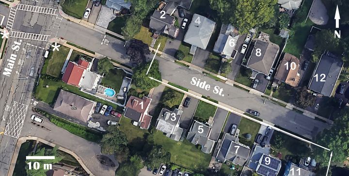 タカが低空飛行するルート(画像右下から現れて、歩道の左側を低空飛行し、急に90度右に旋回して、2番の家の中庭に飛び込む)/ Credit: Dinets, 2025.