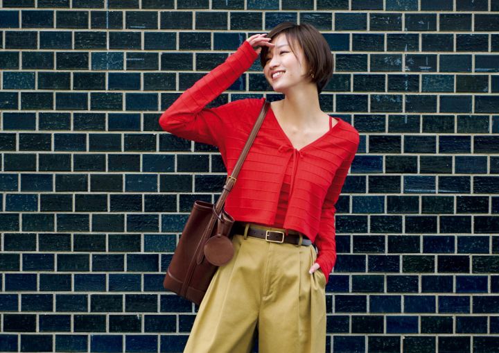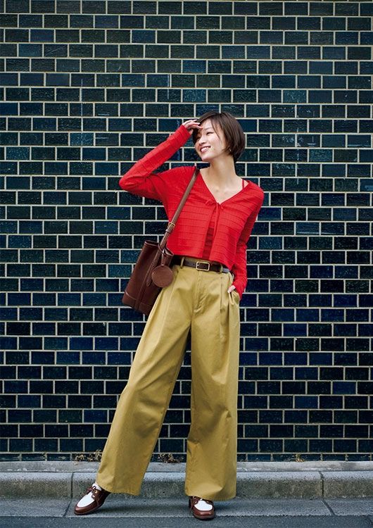 鮮烈な赤ニット×チノパンで今っぽオフィスカジュアル