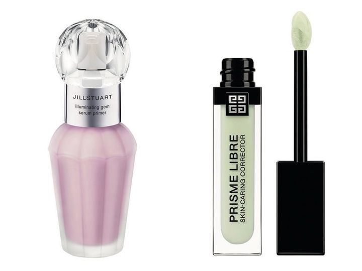 90%がスキンケア成分。赤みをカバーしクリーンな肌印象に。プリズム・リーブル・スキンケアリング・コレクター グリーン ¥5,060(パルファム ジバンシイ[LVMHフレグランスブランズ]) 2.圧倒的な輝きと潤いを与える、透明感UPのラベンダー。イルミネイティングジェム セラムプライマー 01 SPF40・PA+++ 30mL ¥3,850(ジルスチュアート ビューティ)