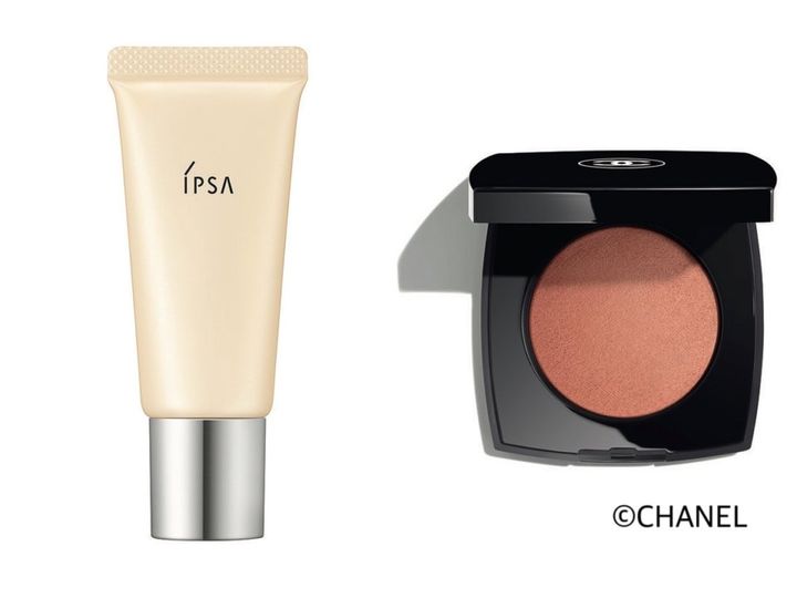 右から:クリーミーな質感で肌に溶け込み、血色感とメリハリを演出。メイクの洗練度を高めるコーラルベージュ。ジュコントゥラスト アンタンス ベージュ エクラタン ¥7,920(シャネル)、自分の素肌に足りない色の光を補う光補整効果により、肌の明るさを高め、透明感も増幅。コントロールベイスe イエロー SPF25・PA++ 20g ¥3,630(イプサ)