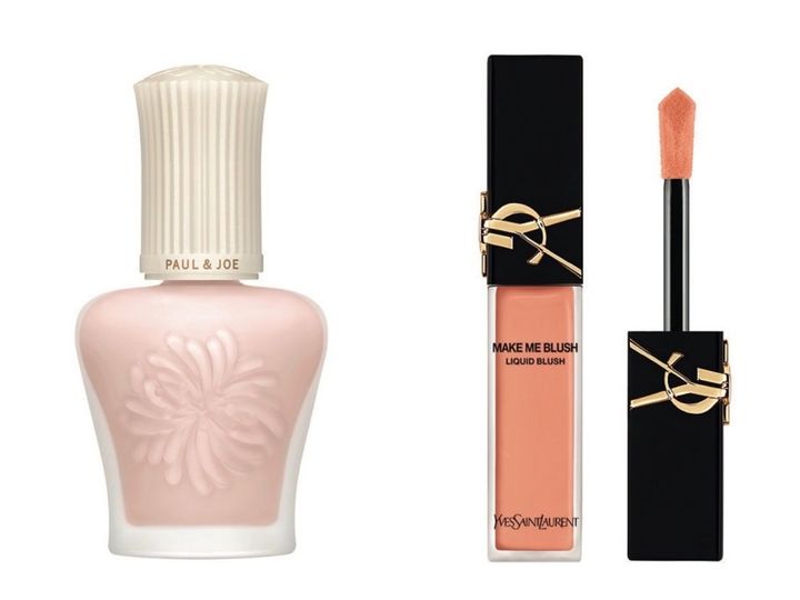極薄膜で瞬時に肌になじみ、頰の内側から染まっているような自然な発色が持続。ミルキーなコーラル。YSL メイクミーブラッシュ リキッド 57¥8,360(イヴ・サンローラン・ボーテ) 2.美容液約90%配合で、カサつきやテカリによる崩れを防止。明るくツヤやかなピンク。プロテクティング プライマー 00 SPF50+・PA++++ 30mL ¥4,070(ポール & ジョー ボーテ)