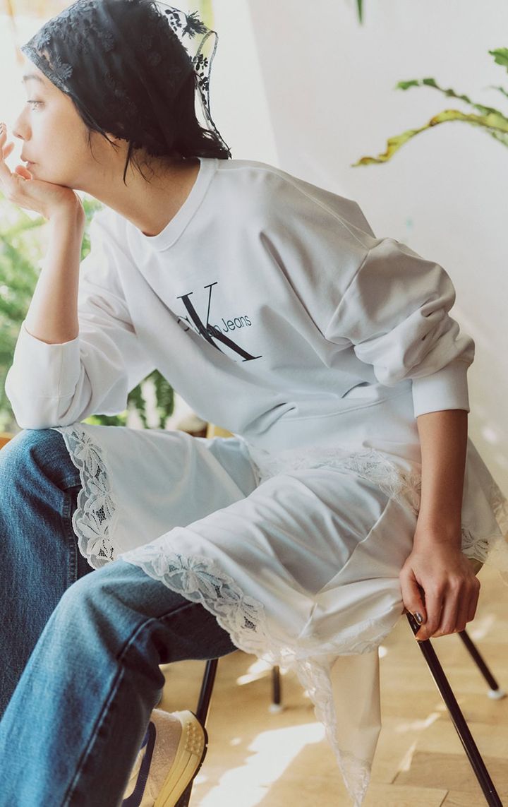 スエット¥17,600(カルバン・クライン/カルバン・クライン カスタマーサービス)、キャミソール¥35,200、スカート¥31,900、デニムパンツ¥31,900(全てアンスクリア/アマン)、バブーシュカ¥6,600(プロヴォーク デザイン ブティック/ジャック・オブ・オール・トレーズ プレスルーム)、スニーカー¥36,300(オートリー/トヨダトレーディング プレスルーム)
