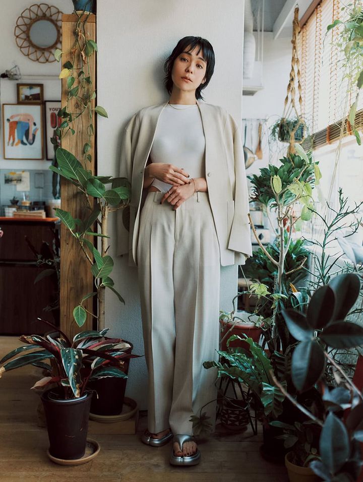 スラックス¥99,000、ジャケット¥154,000(共にバウト/ボウト)、ネックレス¥165,000、ブレスレット¥95,700、リング[人差し指]¥64,900、[中指]¥16,500(全てオールニーク)、ボディスーツ¥18,000(トゥ)、ビーチサンダル¥14,080(ペイズ/ユー バイ スピック&スパン ルミネ池袋店)
