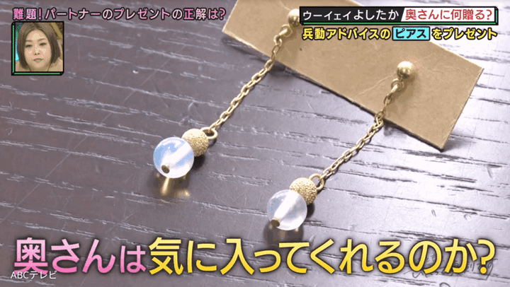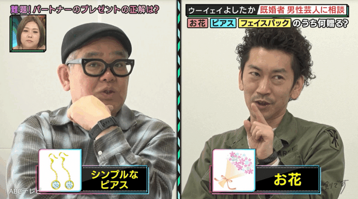 結婚20年目の兵動大樹(矢野・兵動)は、ピアスをチョイス。「これつけて、どっか行かへん?」と、デートの提案までするのがポイントだそうだ。結婚9年目の周平魂(ツートライブ)も「ピアスで勝負したい」派。しかし「一緒に行って選びたかったってなる」と考えを改め、感謝の手紙を添えた花束を渡すことを、よしたかに勧めた。