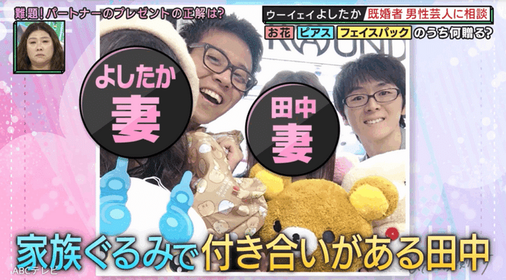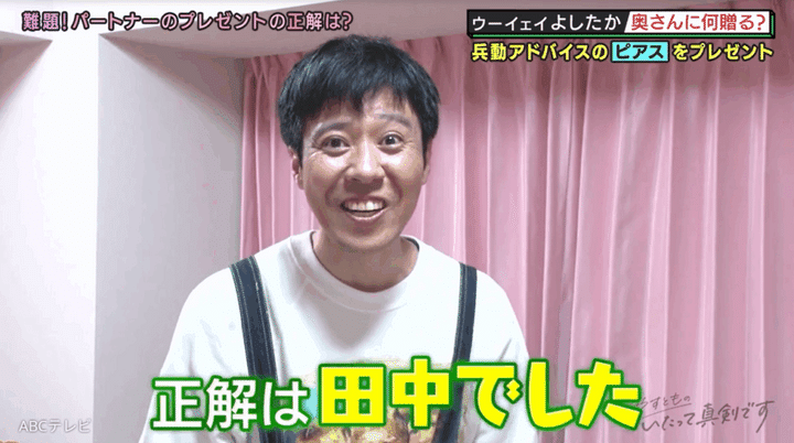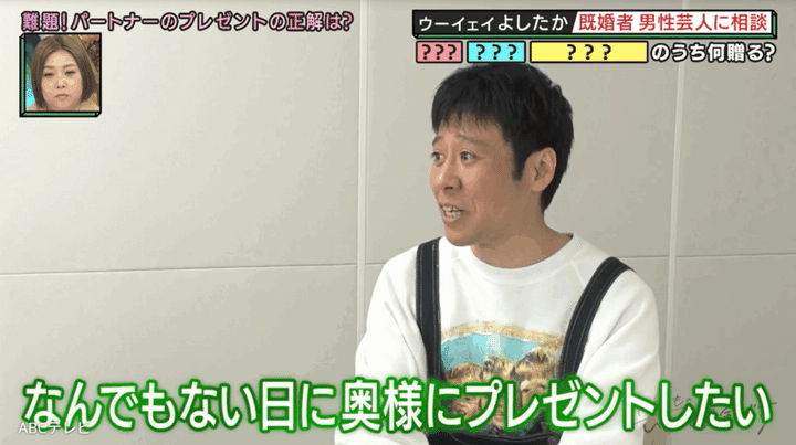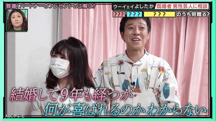なお、悩めるよしたかのプレゼント選びは、5月22日に放送された海原やすよ ともこ司会のバラエティ番組『やすとものいたって真剣です』(ABCテレビ)で行われた。この企画は、既婚者なら「わかるわ~!」と思うこと間違いなし!?